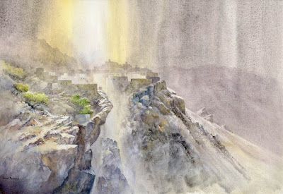 This shows the main part of the composition, the chapel caught in strong sunshine while mist is rising over the backgroiund cliff. Most of the rocks in sunlight have been left as white paper and lacking in detail, while those in shadow stand out in contrasting tones. It is the cast shadow that emphasises the effect of sunlight, further accentuated by the dark foreground rock structures.